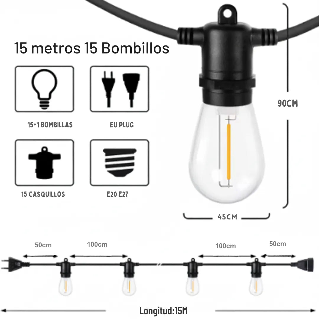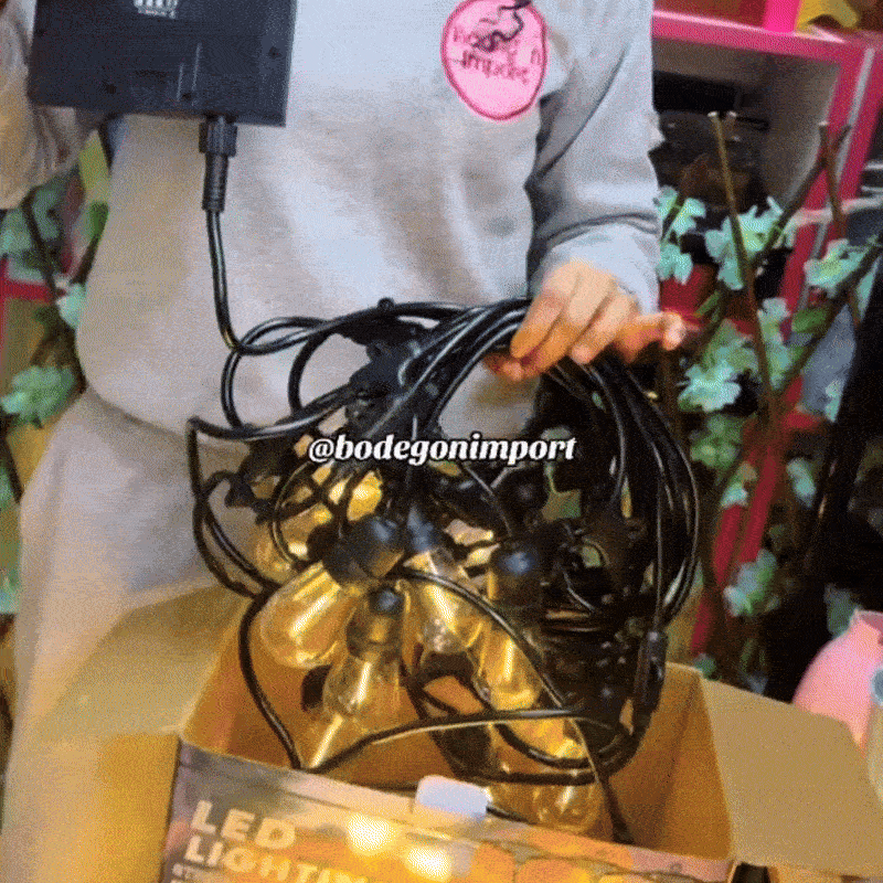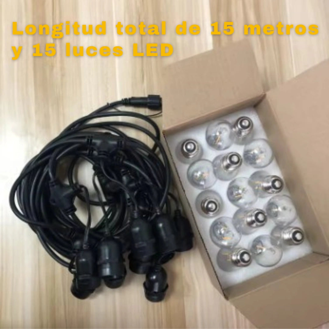 Viene con 15 luces LED de 15 metros de cable reforzado. Los ganchos ya vienen integrados, así que solo la cuelgas donde quieras y listo.